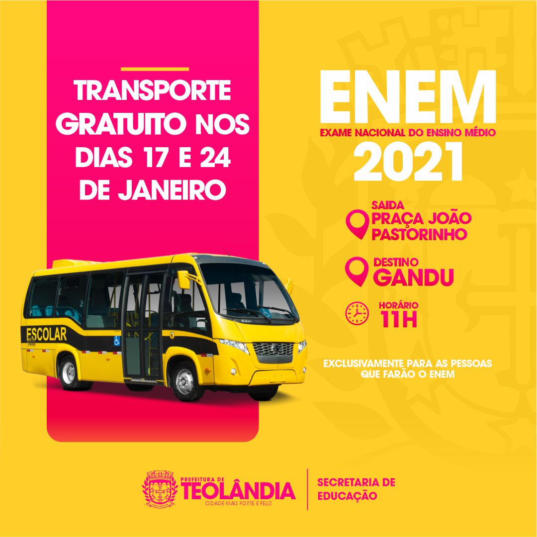A Prefeitura Municipal de Teolândia, junto à Secretaria de Educação e Cultura, disponibilizará transporte gratuito para as pessoas que farão o ENEM nos dias 17 e 24 de Janeiro, com saída da praça João pastorinho, as 11h até a cidade de Gandu.