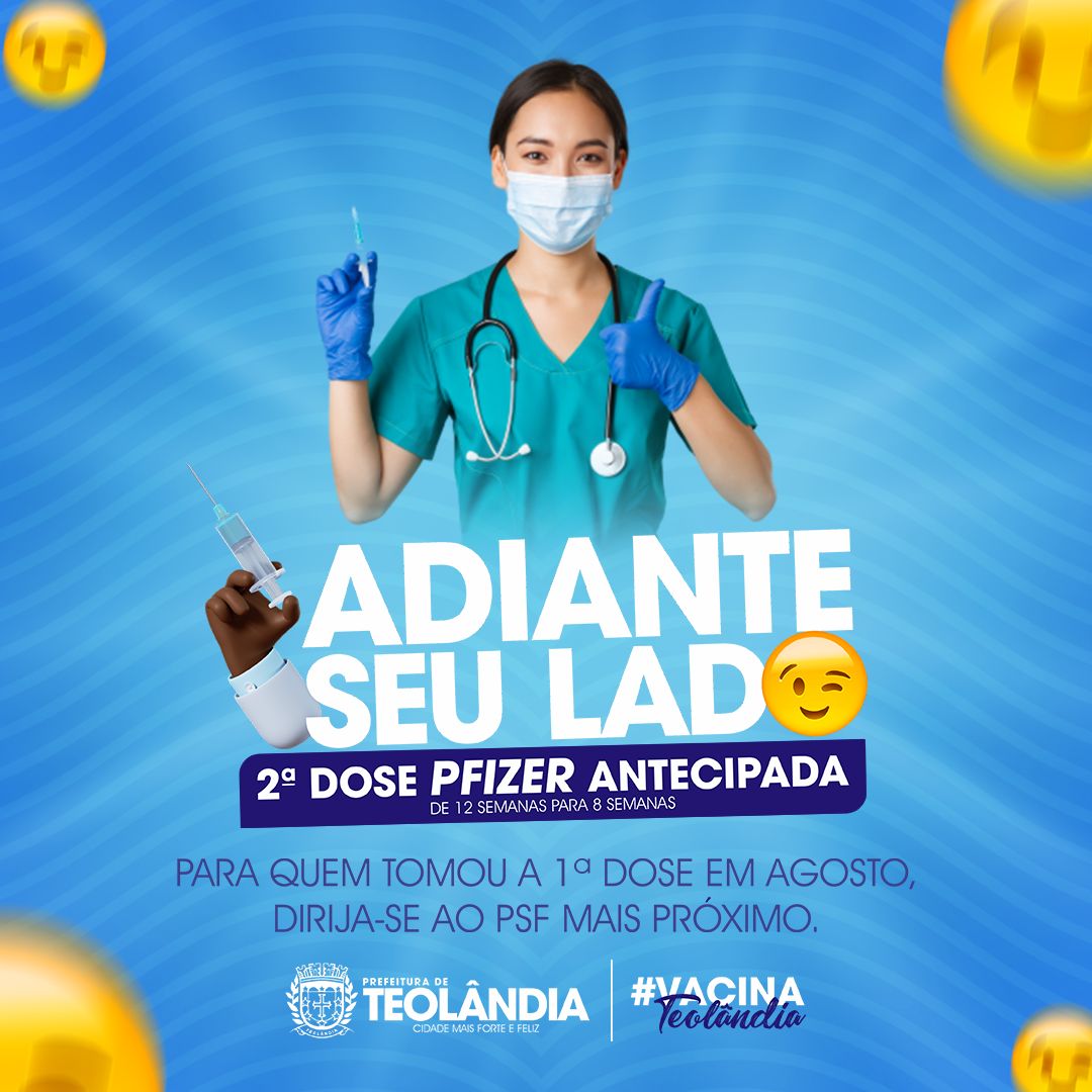 Adiante seu lado 2ª Dose PFIZER antecipada Atenção ao calendário Prefeitura de Teolândia, cidade mais forte e feliz leia mais