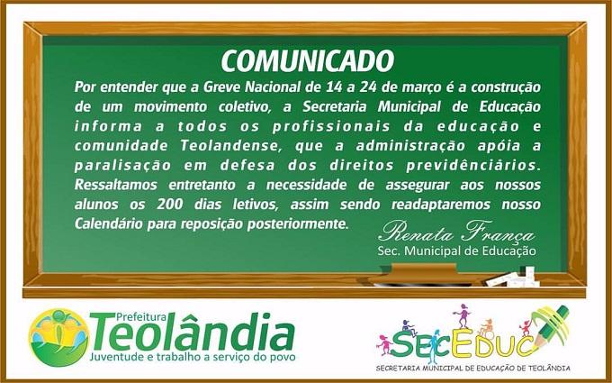 Por entender que a Greve Nacional de 15 a 24 de março é a construção de um movimento coletivo, a Secretária Municipal de Educação informa a todos os profissionais da educação e comunidade Teolandense, que a administração apóia a paralisação em defesa dos direitos previdênciårios. Ressaltamos ... leia mais