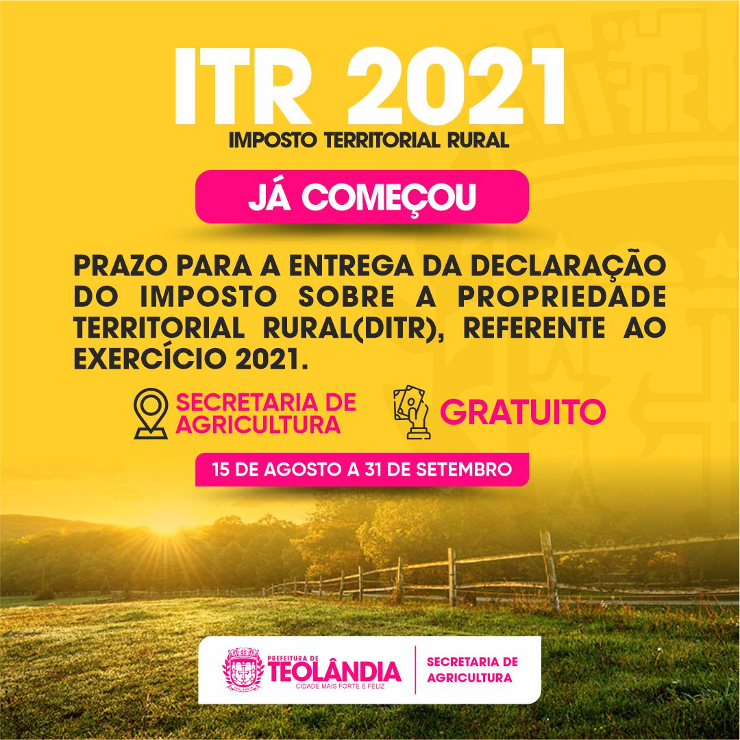 ITR 2021 Já começou! Prazo para a entrega da declaração do imposto sobre a propriedade territorial rural(DITR), referente ao exercício 2021 Local: Secretaria de Agricultura GRATUITO 15 de Agosto a 31 de Setembro Prefeitura de Teolândia, cidade mais forte e feliz! leia mais
