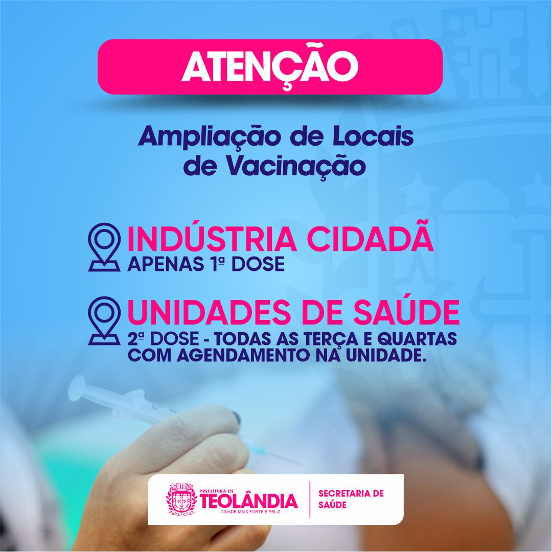 Atenção Visando melhor acesso ao serviço de Vacinação contra Covid -19, a Secretaria de Saúde ampliou os locais de Vacinação, procure a Unidade de Saúde mais próximo de sua casa para o agendamento e garanta sua dose de esperança. Prefeitura de Teolândia, cidade mais forte, feliz e Vacinada. leia mais