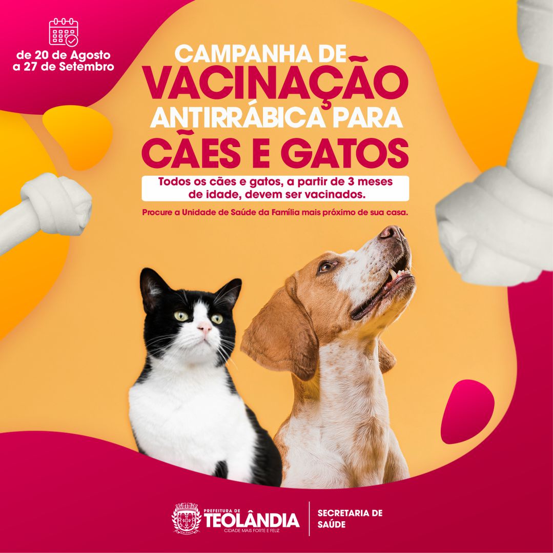 20 de Agosto a 27 de Setembro Unidade de Saúde da família mais próxima. Todos os cães e gatos, a partir de 3 meses de idade, devem ser vacinados. Prefeitura de Teolândia, cidade mais forte e feliz. leia mais