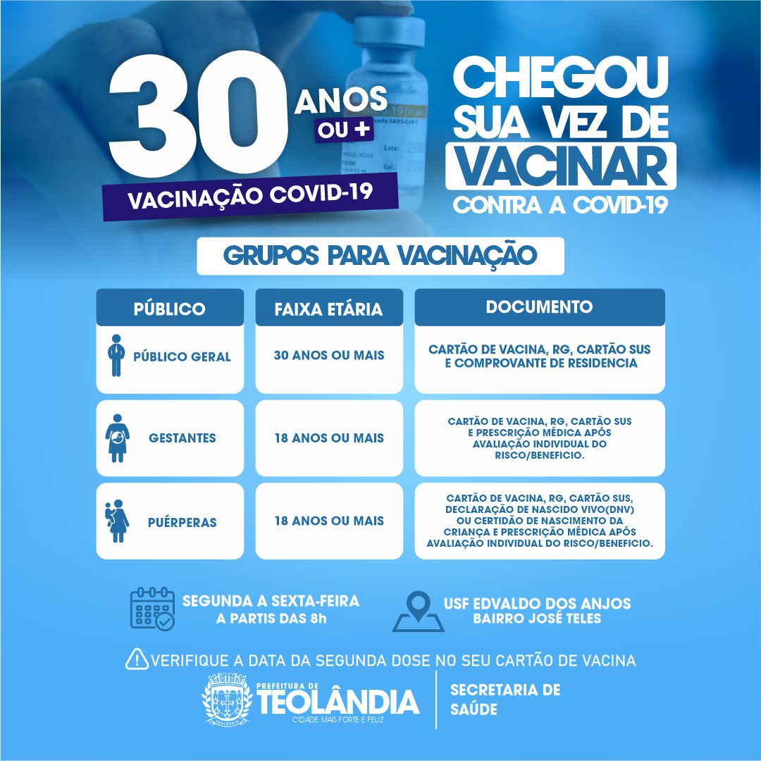 AVISO IMPORTANTE VACINA COVID-19 Vacinação contra Covid-19 para população em geral de 30 anos ou mais, GESTANTES e PUÉRPERAS de 18 anos ou mais De segunda a sexta-feira, a partir das 8h, no USF Edvaldo dos Anjos, no bairro José Teles. As pessoas deverão comparecer com a documentação ... leia mais