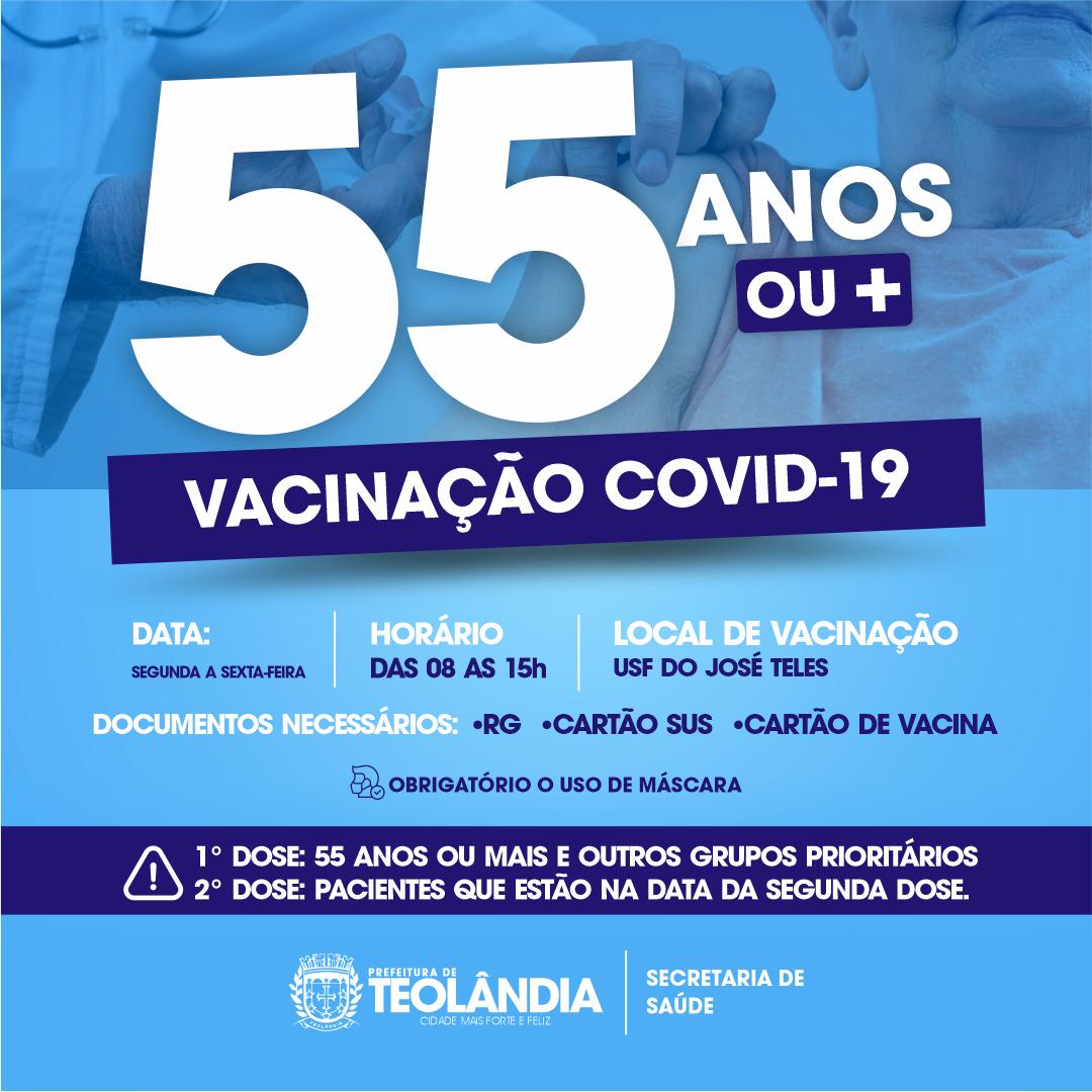 Vacinação contra Covid-19 para população em geral de 55 anos ou + e outros grupos prioritários. A vacinação está acontecendo no USF do José Teles de Segunda a sexta-feira. As pessoas deverão comparecer com a documentação necessária e o uso de máscara é obrigatório. Prefeitura de Teolândia, ... leia mais