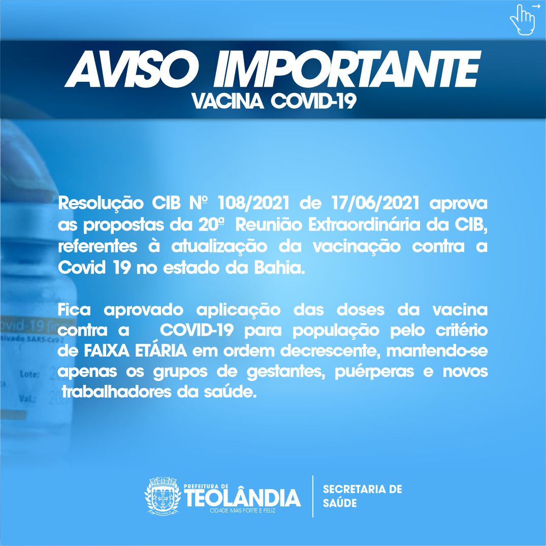 Resolução CIB Nº 108/2021 de 17/06/2021 aprova as propostas da 20ª Reunião Extraordinária da CIB, referentes à atualização da vacinação contra a Covid 19 no estado da Bahia. Fica aprovado aplicação das doses da vacina contra a COVID-19 para população pelo critério de FAIXA ETÁRIA em ordem ... leia mais
