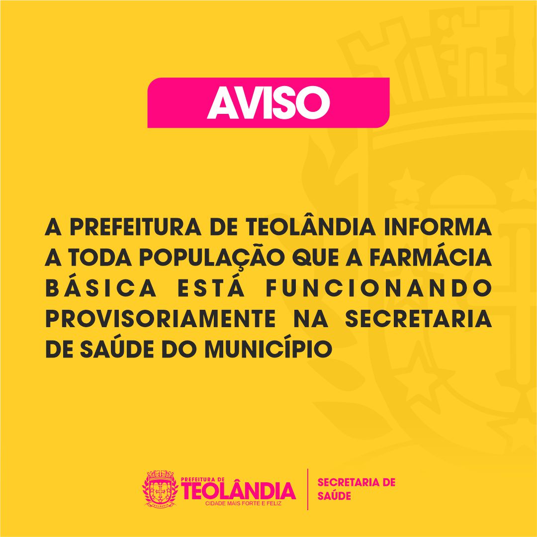 A PREFEITURA DE TEOLÂNDIA INFORMA A TODA POPULAÇÃO QUE A FARMÁCIA BÁSICA ESTÁ FUNCIONANDO PROVISORIAMENTE NA SECRETARIA DE SAÚDE DO MUNICÍPIO. PREFEITURA DE TEOLÂNDIA, CIDADE MAIS FORTE E FELIZ. leia mais
