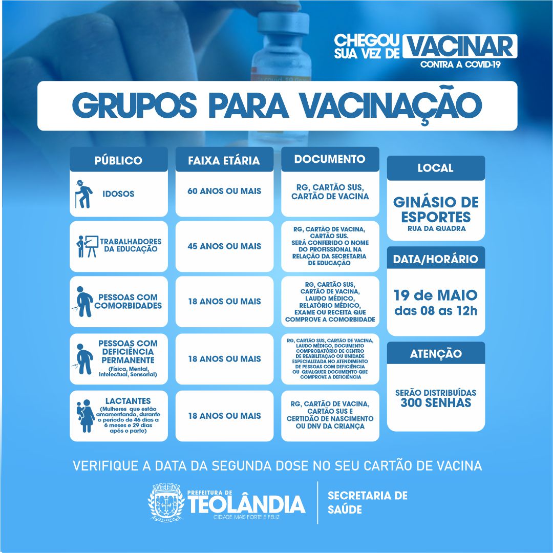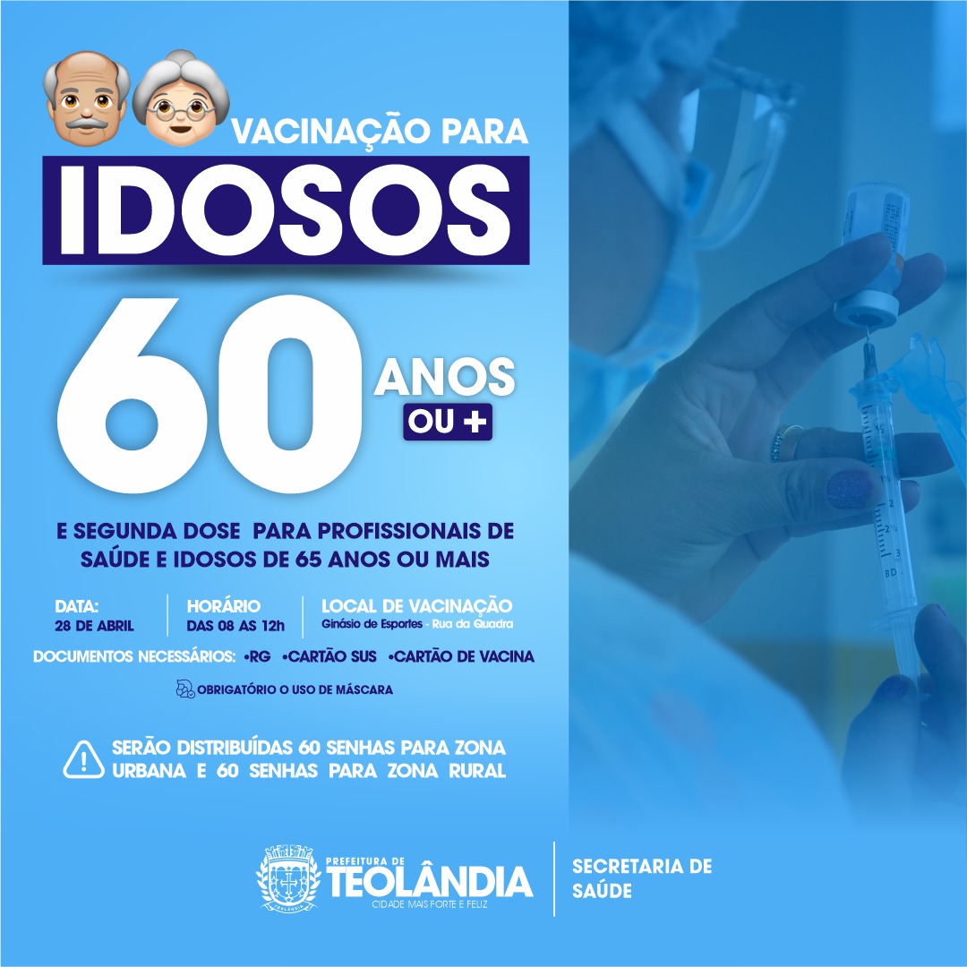 ATENÇÃO A secretaria de Saúde informa que no dia 28 de Abril (Quarta -Feira) das 8h as 12h daremos continuidade a vacinação contra Covid-19: 1° Dose para os idosos de 60 anos ou + que ainda não foram vacinados; 2°Dose dos pacientes que já estão na data da segunda dose (confira a data no ... leia mais