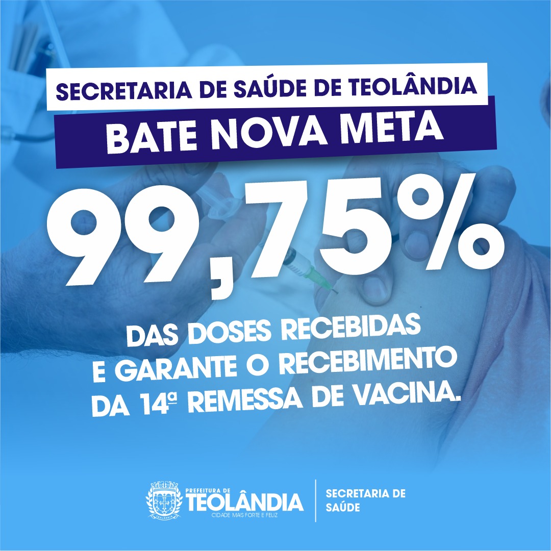 Secretaria de Saúde de Teolândia bate nova meta, 99,75% das doses recebidas e garante o recebimento da 14ª remessa de vacina. Prefeitura de Teolândia, cidade mais forte, feliz e vacinada. leia mais