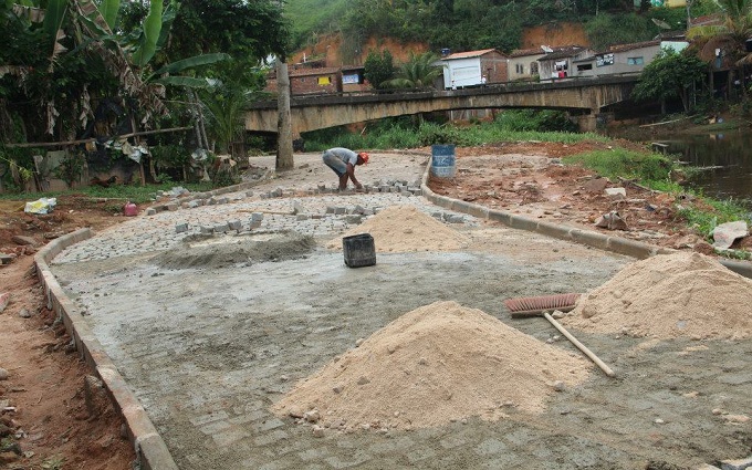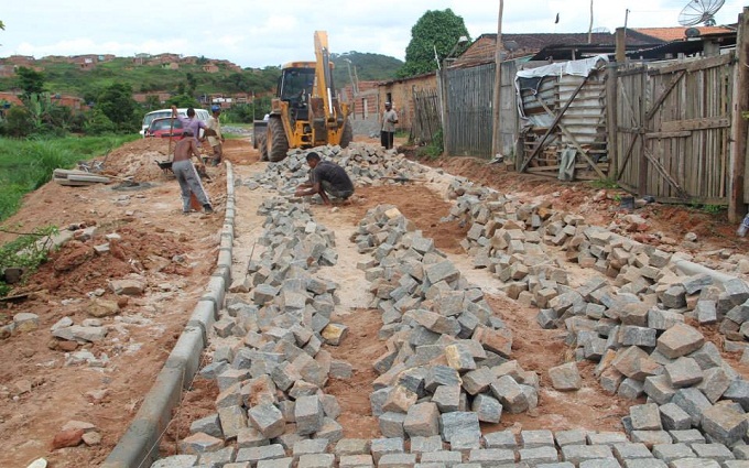 PAVIMENTAÇÃO DA ÁREA DA FESTA DA BANANA ESTÁ BEM AVANÇADA.