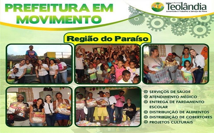O Projeto Prefeitura em Movimento levou grandes benefícios aos moradores da região do Paraíso, através de uma ação integrada, que reúne todas as secretarias municipais, intensificando por um dia o atendimento público. Uma verdadeira força tarefa que levou à comunidade diversos serviços, como atendimento médico, entrega de fardamento, serviços da Secretaria de Saúde, Serviços da Secretaria de Ação Social, Distribuição de Cestas Básicas, cobertores e muito mais.